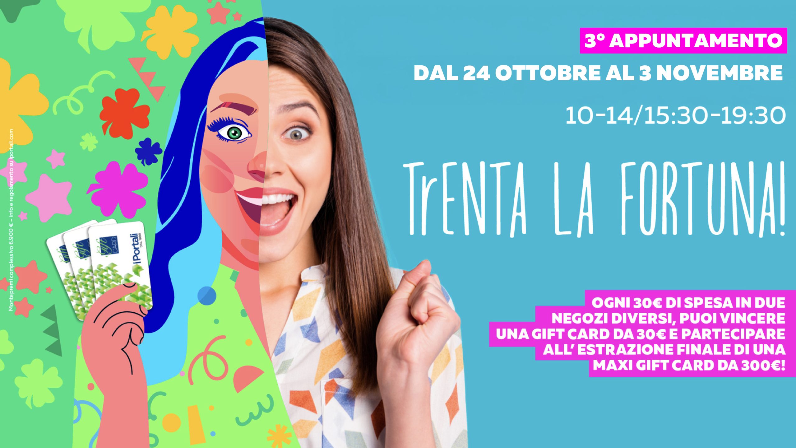 Dal 24 ottobre al 2 novembre, ogni giorno dalle 10:00 alle 14:00 e dalle 15:30 alle 19:30, basta una spesa di almeno 30€ in due negozi diversi (Ipercoop compreso) per provare a vincere subito una Gift Card da 30€ e partecipare all’estrazione finale di una Maxi Gift Card da 300€.